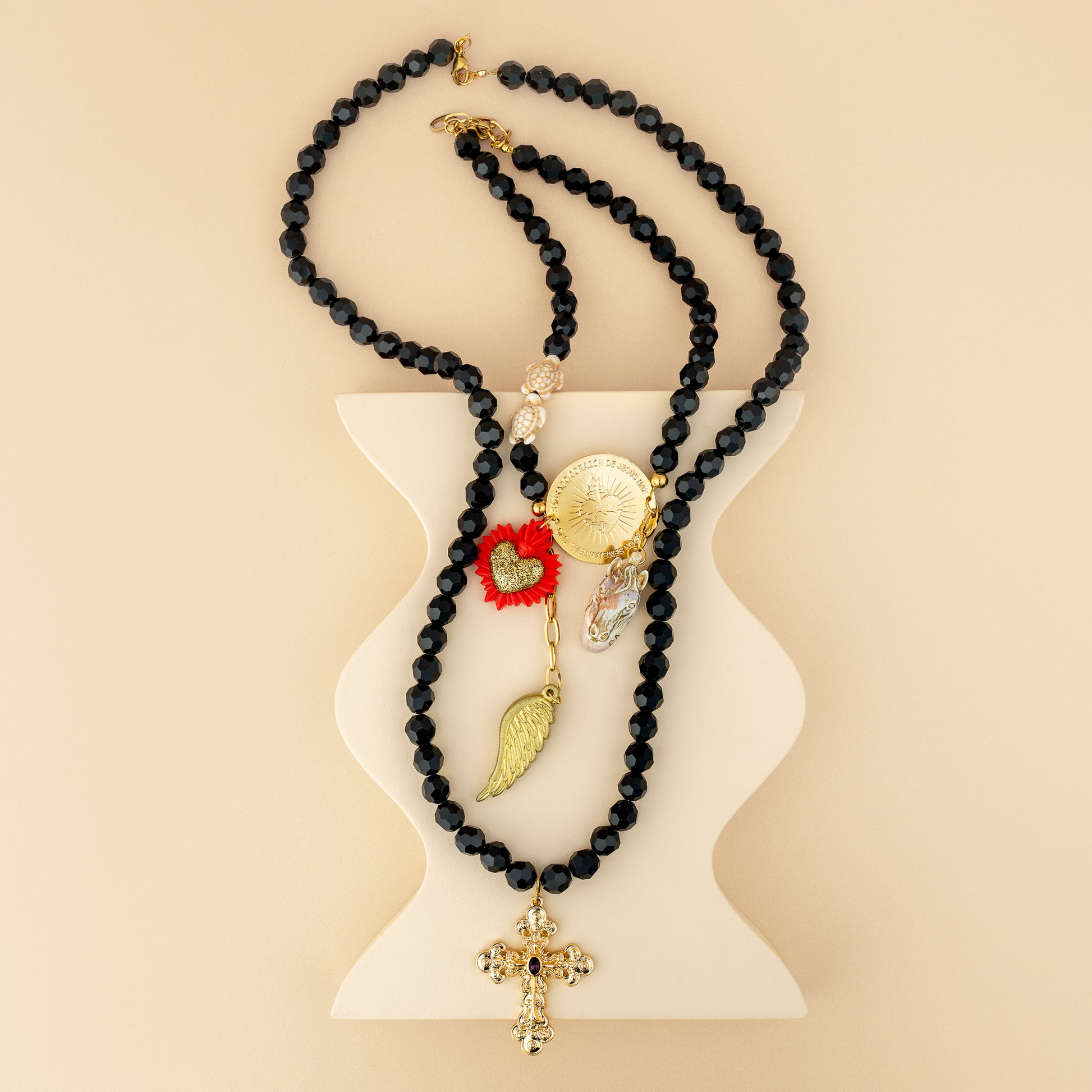 A bold black Murano glass bead necklace finished with curated gold-tone charm, featuring a cross.